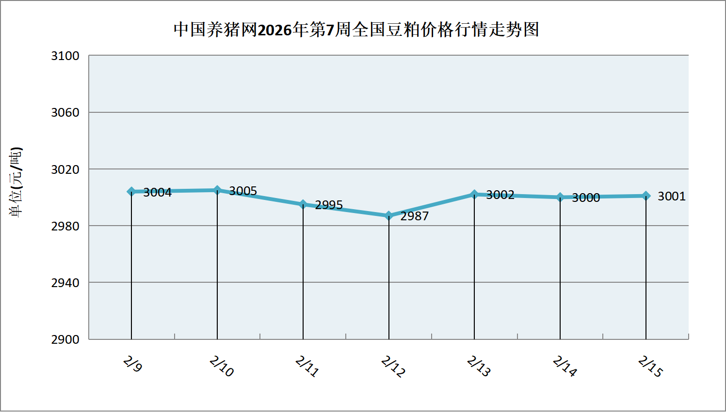 据中国养猪网猪价系统数据监测,2026年第7周(2026年02月09日至2026年02月15日)本周豆粕价格整体呈震荡态势。全周豆粕价格区间在2987-3004元/吨,周初豆粕价格为3004元/吨,周末价格为3001元/吨,全周豆粕价格累计下跌了3元/吨。