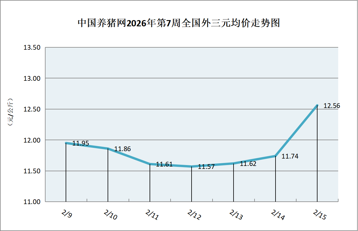 据中国养猪网猪价系统数据监测,2026年第7周(2026年02月09日至2026年02月15日)全国外三元生猪价格呈现先跌后涨态势,周末强势上扬。整体区间在11.57-12.56元/公斤之间!周初猪价为12.56元/公斤,周末猪价为12.45元/公斤,全周猪价累计上涨了0.61元/公斤。