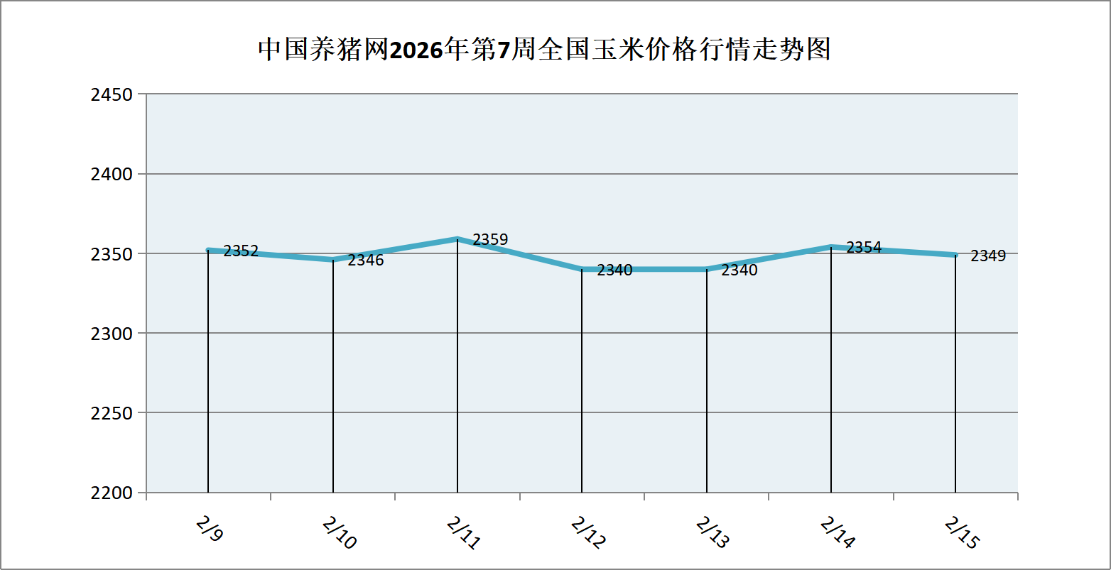 据中国养猪网猪价系统数据监测,2026年第7周(2026年02月09日至2026年02月15日)本周玉米价格整体呈震荡调整态势。全周玉米价格区间在2340-2359元/吨之间,周初玉米价格为2352元/吨,周末价格为2349元/吨,全周玉米价格累计下跌了3元/吨。