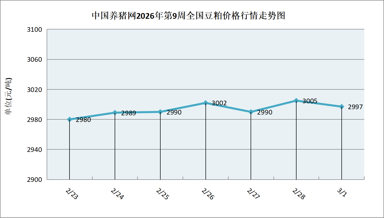据中国养猪网猪价系统数据监测,2026年第9周(2026年02月23日至2026年03月01日)本周豆粕价格整体呈小幅上涨走势。全周豆粕价格区间在2980-3005元/吨,周初豆粕价格为2980元/吨,周末价格为2997元/吨,全周豆粕价格累计上涨了17元/吨。