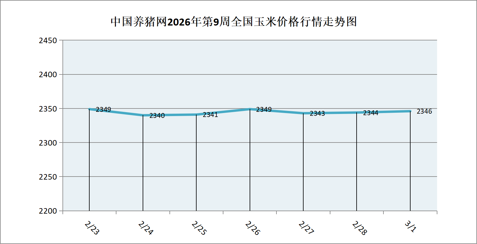 据中国养猪网猪价系统数据监测,2026年第9周(2026年02月23日至2026年03月01日)本周玉米价格整体呈小幅波动走势。全周玉米价格区间在2340-2349元/吨之间,周初玉米价格为2349元/吨,周末价格为2346元/吨,全周玉米价格累计上涨了3元/吨。