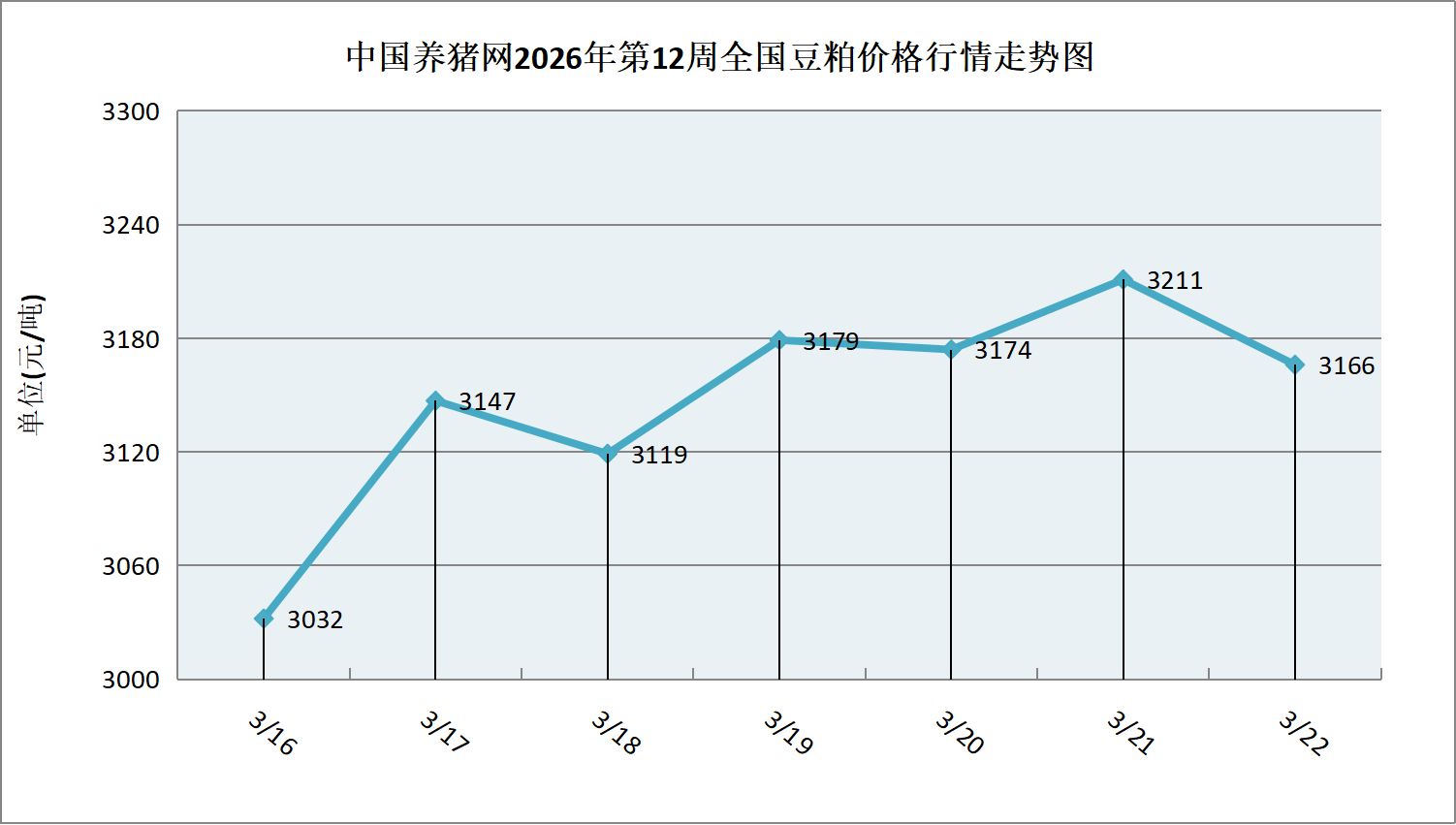 据中国养猪网猪价系统数据监测,2026年第12周(2026年03月16日至2026年03月22日)本周豆粕价格整体呈大幅上涨态势。全周豆粕价格区间在3032-3211元/吨,周初豆粕价格为3032元/吨,周末价格为3166元/吨,全周豆粕价格累计上涨了134元/吨。