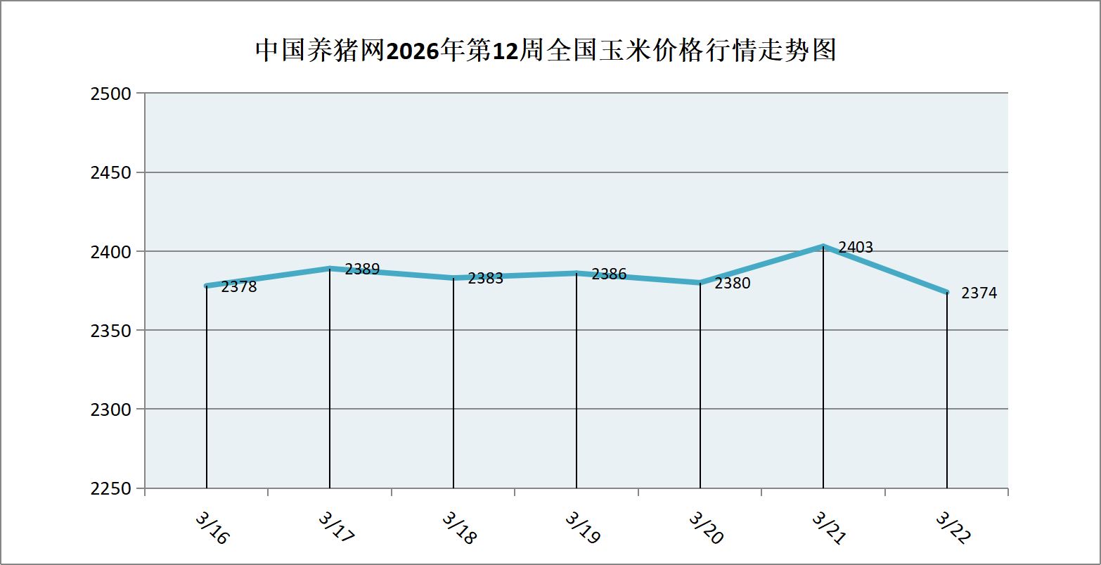 据中国养猪网猪价系统数据监测,2026年第12周(2026年03月16日至2026年03月22日)本周玉米价格周内窄幅震荡。全周玉米价格区间在2374-2403元/吨之间,周初玉米价格为2378元/吨,周末价格为2374元/吨,全周玉米价格累计下跌了4元/吨。
