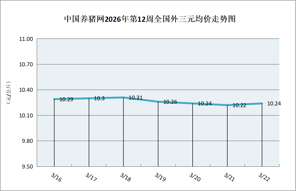 据中国养猪网猪价系统数据监测,2026年第12周(2026年03月16日至2026年03月22日)全国外三元生猪价格整体弱势调整。整体区间在10.22-10.31元/公斤之间!周初猪价为10.29元/公斤,周末猪价为10.24元/公斤,全周猪价累计下跌了0.05元/公斤。