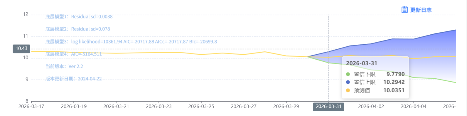 玄田算法是由项目课题组团队原创的非经典逻辑数值聚合理论和不确定性预测方法,构建了基于一致模算子的生猪价格预测模型。该模型采用的聚合函数及一致模相关理论与方法已获得多项国家自然科学基金和省级自然科学资金资助,并获得多项省级自然科学奖奖项。03月31日预测猪价为10.0351,置信区间在9.7790--10.2942之间。04月01日预测猪价为10.1184;04月02日预测猪价为10.0479。