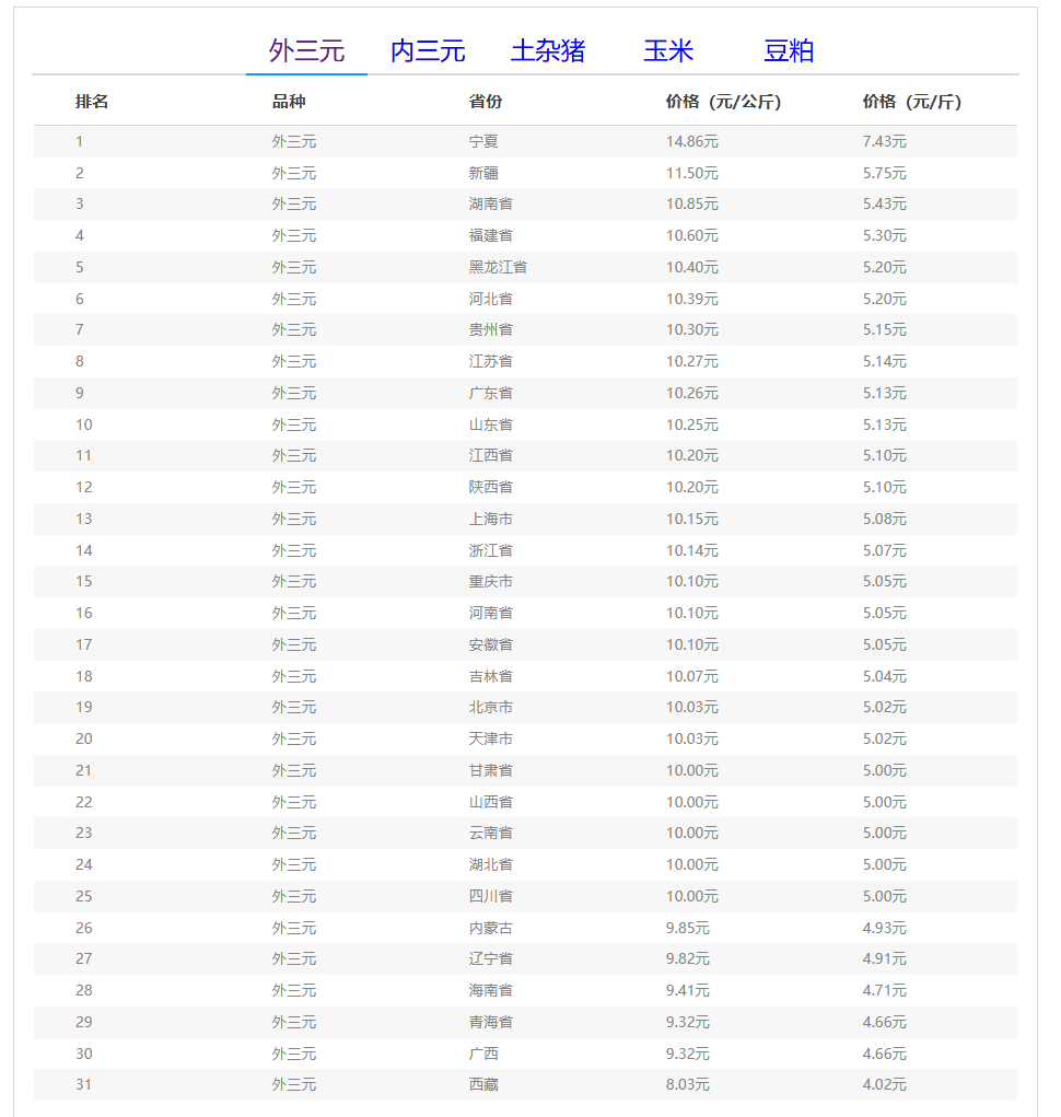 具体来看部分地区的生猪价格,上海市今日生猪(外三元)的价格为10.15元/公斤,宁夏回族自治区今日生猪(外三元)的价格为14.86元/公斤,湖北省今日生猪(外三元)的价格为10.00元/公斤,内蒙古自治区今日生猪(外三元)的价格为9.85元/公斤,海南省今日生猪(外三元)的价格为9.41元/公斤,吉林省今日生猪(外三元)的价格为10.07元/公斤,西藏自治区今日生猪(外三元)的价格为8.03元/公斤,安徽省今日生猪(外三元)的价格为10.10元/公斤,浙江省今日生猪(外三元)的价格为10.14元/公斤,江苏省今日生猪(外三元)的价格为10.27元/公斤。