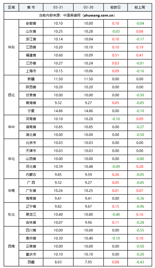 相较上周(2026年03月24日)10.26元/公斤,价格下跌了0.15元/公斤;