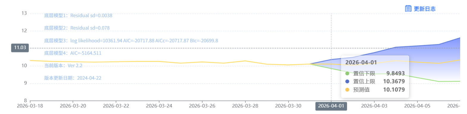 玄田算法是由项目课题组团队原创的非经典逻辑数值聚合理论和不确定性预测方法,构建了基于一致模算子的生猪价格预测模型。该模型采用的聚合函数及一致模相关理论与方法已获得多项国家自然科学基金和省级自然科学资金资助,并获得多项省级自然科学奖奖项。04月01日预测猪价为10.1079,置信区间在9.8493--10.3679之间。04月02日预测猪价为10.0404;04月03日预测猪价为10.1451。
