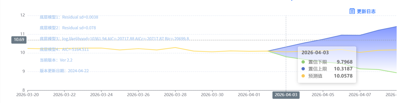 玄田算法是由项目课题组团队原创的非经典逻辑数值聚合理论和不确定性预测方法,构建了基于一致模算子的生猪价格预测模型。该模型采用的聚合函数及一致模相关理论与方法已获得多项国家自然科学基金和省级自然科学资金资助,并获得多项省级自然科学奖奖项。04月03日预测猪价为10.0578,置信区间在9.7968--10.3187之间。04月03日预测猪价为10.0578;04月05日预测猪价为10.1128。