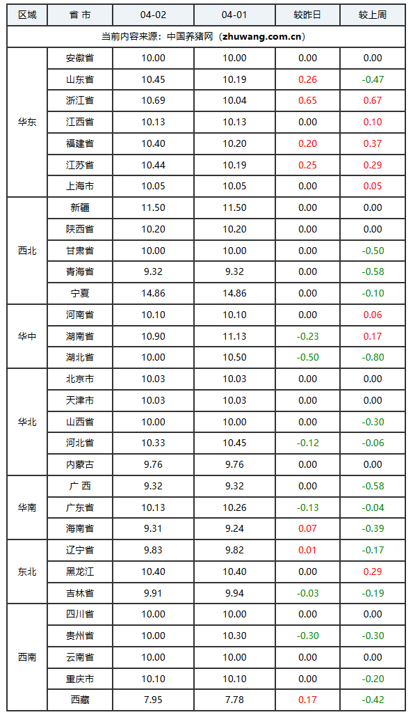 据中国养猪网统计,04月02日,全国外三元生猪价格均价为10.10元/公斤,较昨日报价上涨了0.01元/公斤。全国猪价最高为宁夏回族自治区14.86元/公斤,最低为西藏自治区7.95元/公斤。整体看来,今日外三元生猪价格走势为7涨18平6跌。