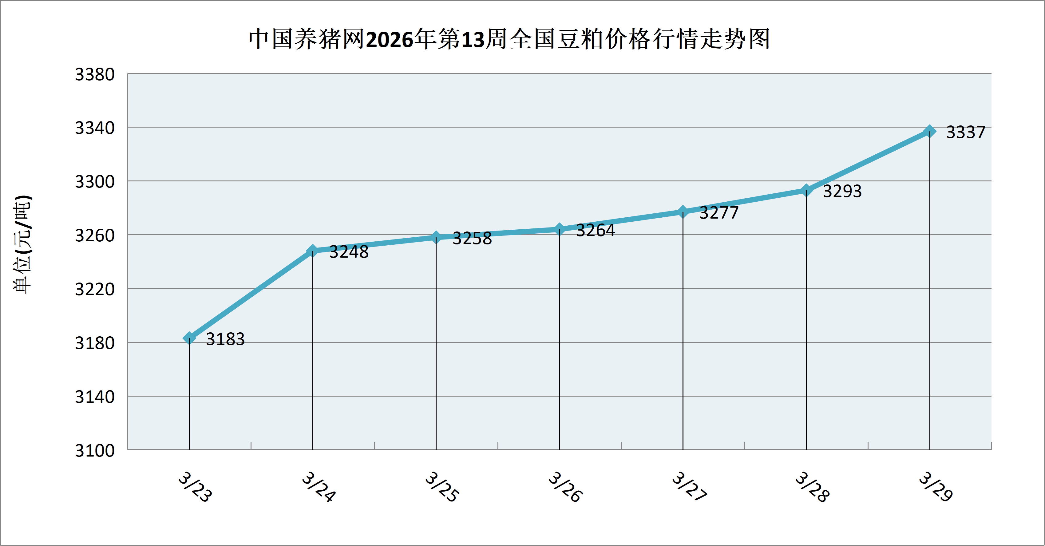据中国养猪网猪价系统数据监测,2026年第13周(2026年03月23日至2026年03月29日)本周豆粕价格周内持续走高。全周豆粕价格区间在3183-3337元/吨,周初豆粕价格为3183元/吨,周末价格为3337元/吨,全周豆粕价格累计上涨了154元/吨。