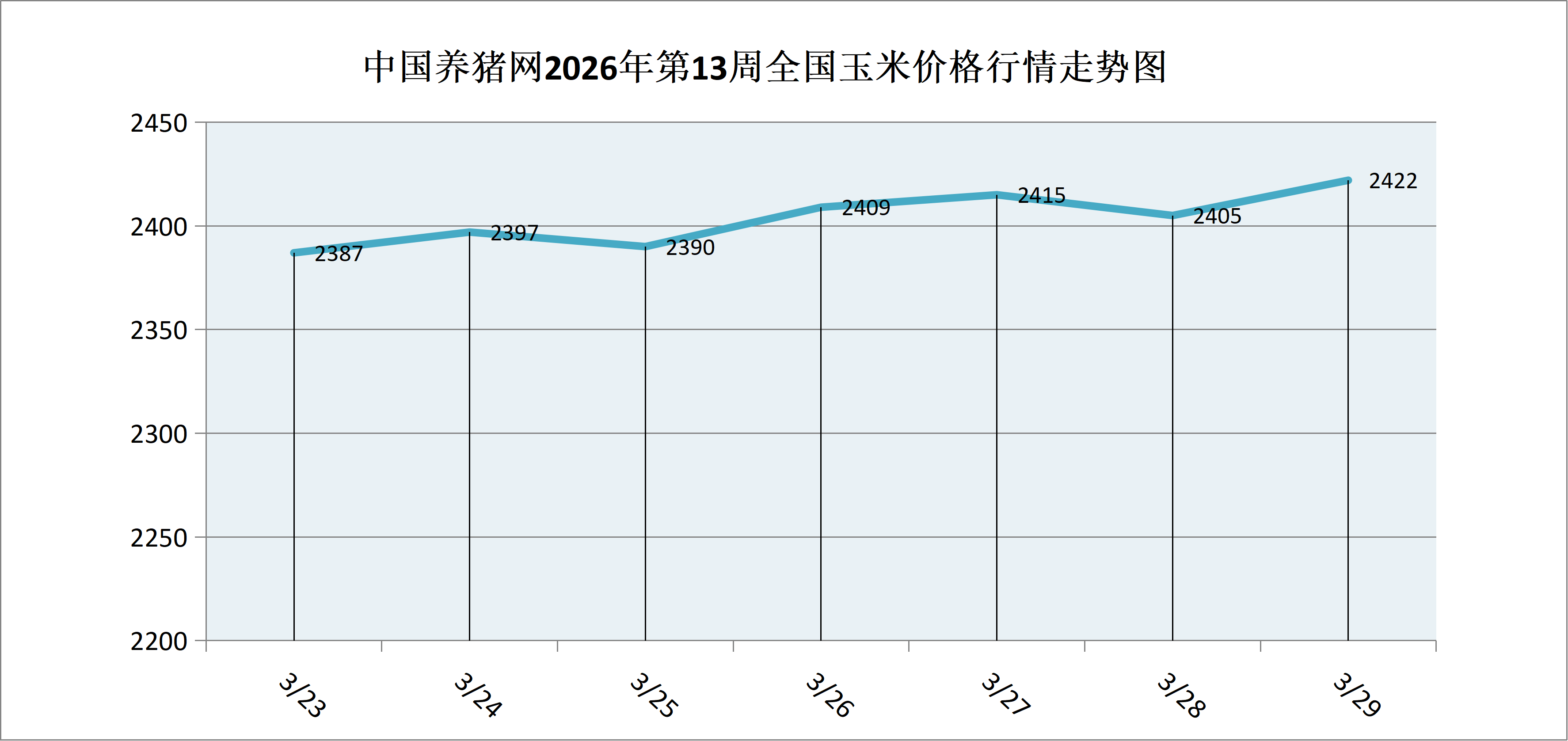 据中国养猪网猪价系统数据监测,2026年第13周(2026年03月23日至2026年03月29日)本周玉米价格呈周内震荡上行趋势。全周玉米价格区间在2387-2422元/吨之间,周初玉米价格为2387元/吨,周末价格为2422元/吨,全周玉米价格累计上涨了35元/吨。