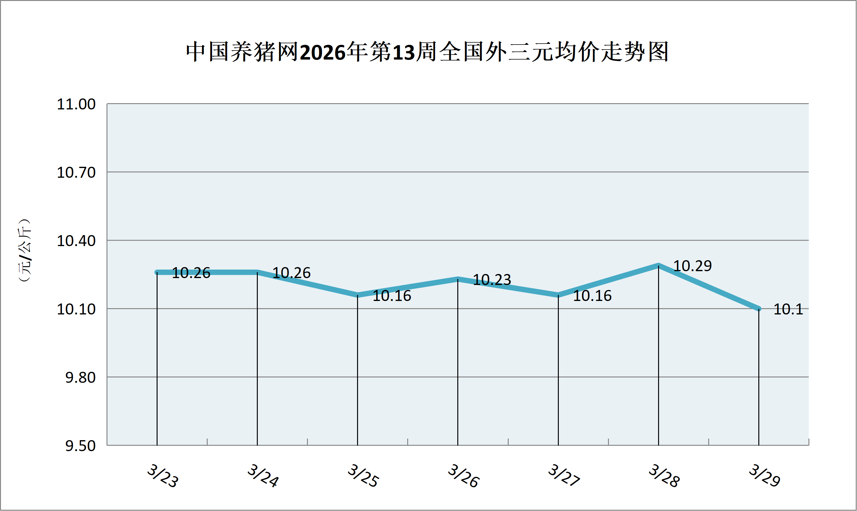 据中国养猪网猪价系统数据监测,2026年第13周(2026年03月23日至2026年03月29日)全国外三元生猪价格呈震荡波动走向。整体区间在10.10-10.29元/公斤之间!周初猪价为10.26元/公斤,周末猪价为10.10元/公斤,全周猪价累计下跌了0.16元/公斤。