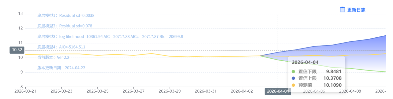 玄田算法是由项目课题组团队原创的非经典逻辑数值聚合理论和不确定性预测方法,构建了基于一致模算子的生猪价格预测模型。该模型采用的聚合函数及一致模相关理论与方法已获得多项国家自然科学基金和省级自然科学资金资助,并获得多项省级自然科学奖奖项。04月04日预测猪价为10.1090,置信区间在9.8481--10.3708之间。04月05日预测猪价为10.1032;04月06日预测猪价为10.1619。
