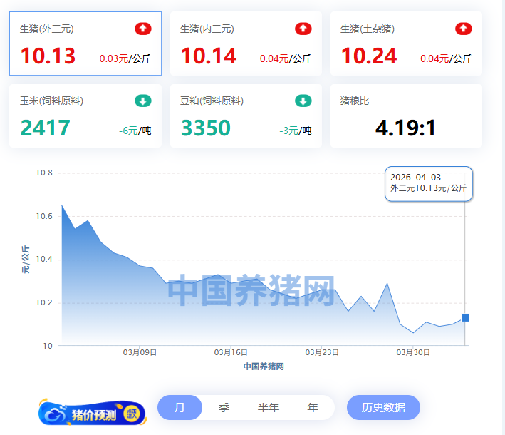 相较昨日(2026年04月02日)10.10元/公斤,价格上涨了0.03元/公斤;