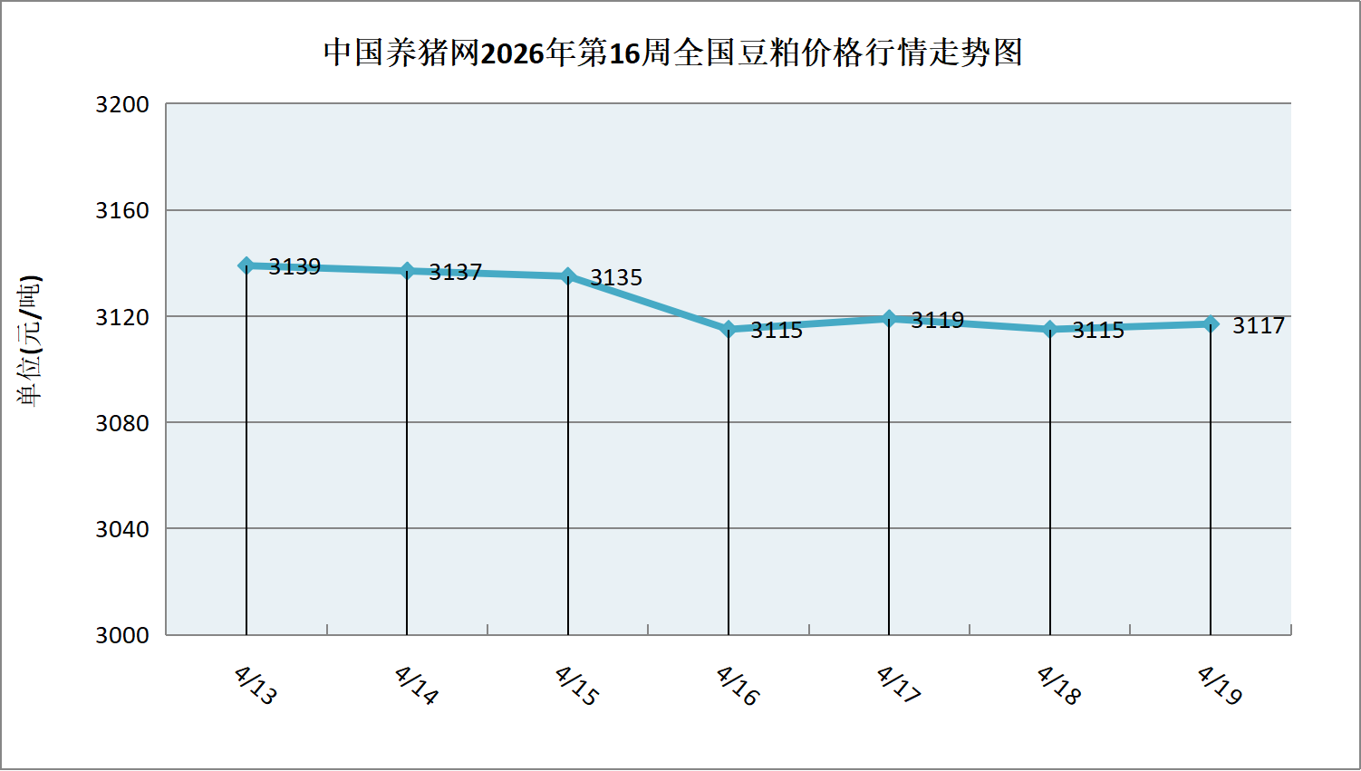 据中国养猪网猪价系统数据监测,2026年第16周(2026年04月13日至2026年04月19日)本周豆粕价格周初较为平稳,周中出现下跌势态,周末行情呈现窄幅波动。全周豆粕价格区间在3115-33139元/吨,周初豆粕价格为3139元/吨,周末价格为3117元/吨,全周豆粕价格累计下跌了22元/吨。