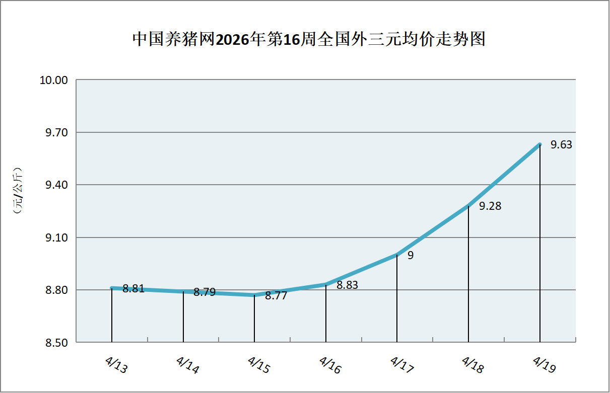 据中国养猪网猪价系统数据监测,2026年第16周(2026年04月13日至2026年04月19日)全国外三元生猪价格周初趋于平稳,周中至周末呈现大幅上涨势态。整体区间在8.77-9.63元/公斤之间!周初猪价为8.81元/公斤,周末猪价为9.63元/公斤,全周猪价累计上涨了0.82元/公斤。