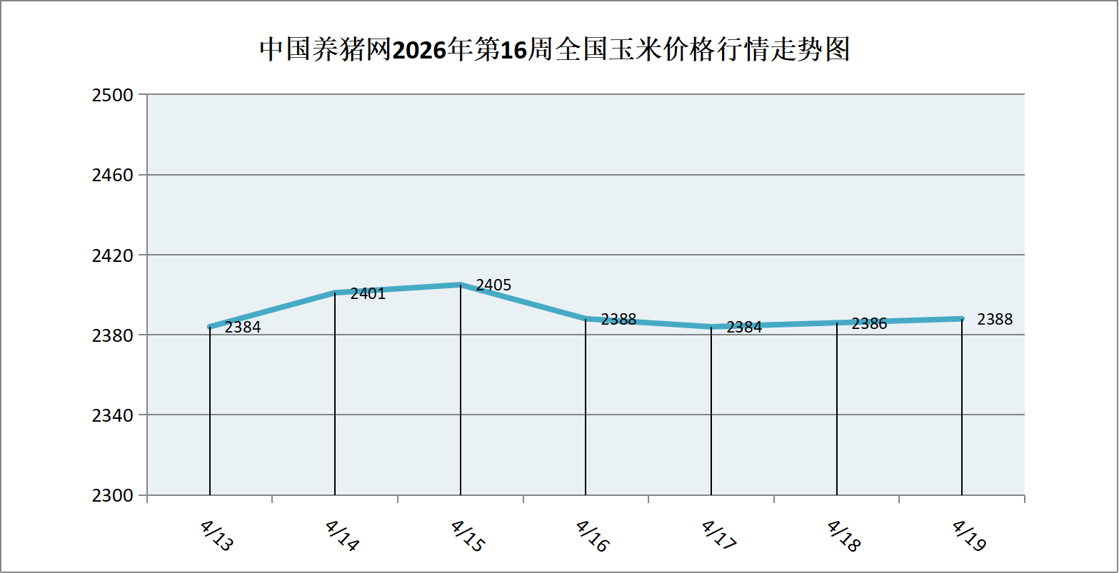 据中国养猪网猪价系统数据监测,2026年第16周(2026年04月13日至2026年04月19日)本周玉米价格呈现周内窄幅波动的走势。全周玉米价格区间在2384-2405元/吨之间,周初玉米价格为2384元/吨,周末价格为2388元/吨,全周玉米价格累计上涨了4元/吨。