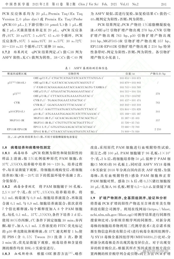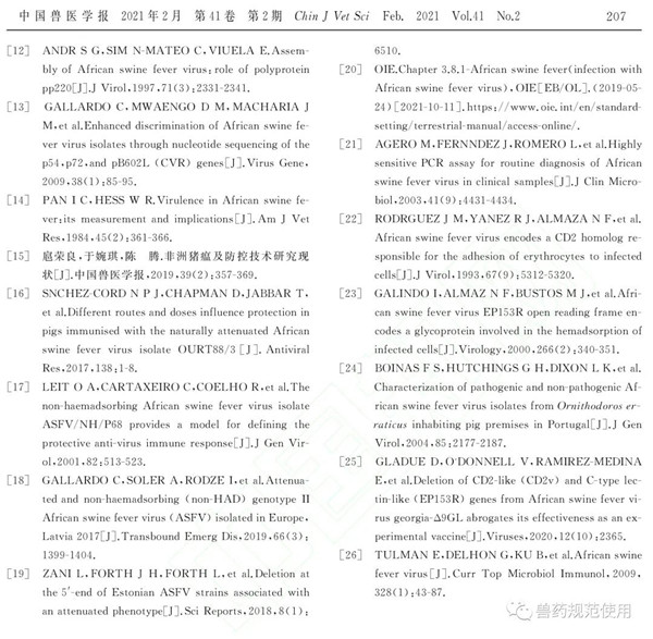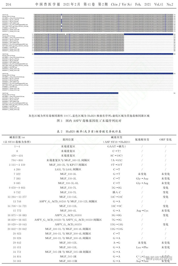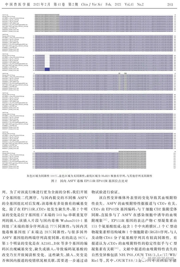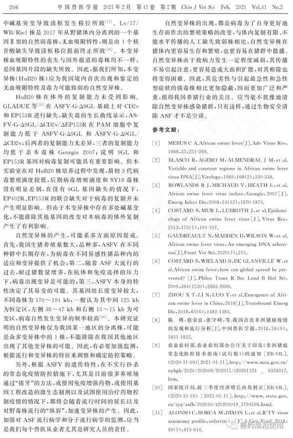 2021年2月,《中国兽医学报》刊出由军事科学院军事医学研究院军事兽医研究所完成的研究论文《1株非洲猪瘟病毒自然变异毒株的鉴定》,文章指出,非洲猪瘟(ASF)于2018年传入我国后已流行了2年有余,我国非洲猪瘟病毒(ASFV)毒株未曾出现较大变异。最近,针对我国ASF疫情放缓以及感染猪出现的低死亡率现象,我们在ASFV生态学研究中,从主动监测的样品中分离到1株源自湖北某地的ASFV自然变异株。