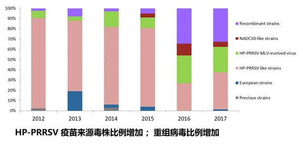 “PRRSV 疫苗毒的演化与野毒株的重组是驱动毒株多样性和新毒株产生的重要机制,类 NADC30 与疫苗病毒重组频繁。”周磊表示,从国内多家科研机构对蓝耳病的跟踪研究来看,从2012年以来,重组毒株的检出率不断提高。而每一次重组都会导致原来蓝耳病稳定的猪场暴发新的疫情。