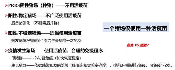 周磊指出,针对PRRS不同类型猪场的疫苗使用原则也不一样(如下图)。