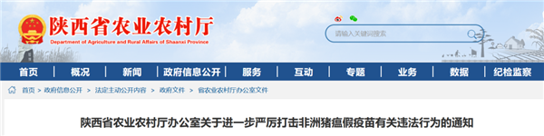 日前,陕西省农业农村厅下发通知,加大非洲猪瘟假疫苗打击力度,落实最严厉处罚措施。