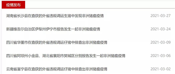 据了解,3月以来,农业农村部已公布多起非洲猪瘟疫情,包括云南1起、四川2起、湖北1起、新疆1起、湖南1起,其中5起都与违规调运有关。