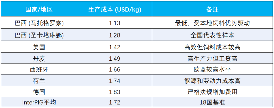 数据来源:InterPIG 2022报告(Embrapa和Wageningen Economic Research)。2024年欧盟数据来自AHDB(以英镑计,汇率约1.26美元/英镑转换)。