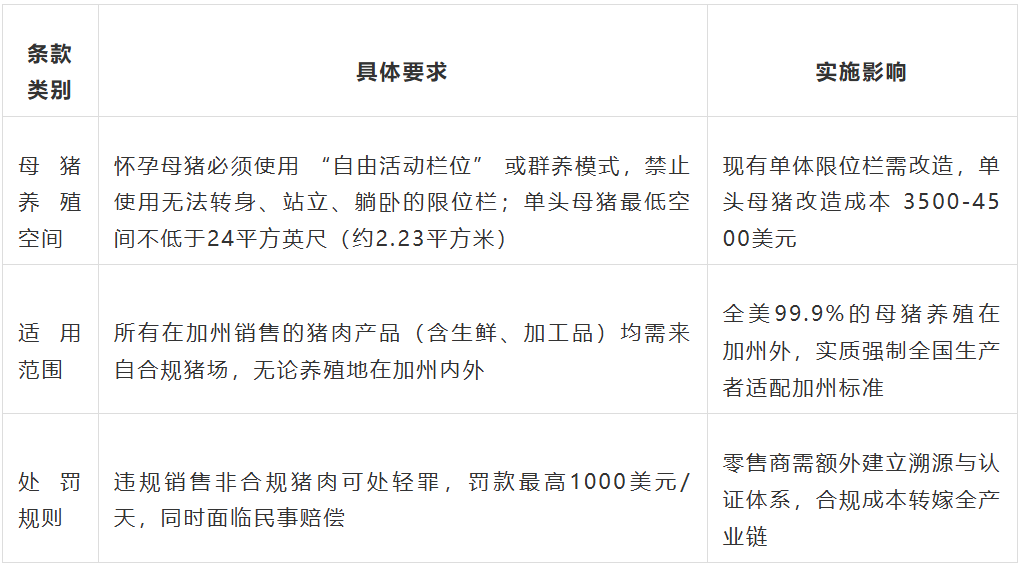 核心争议标的:加州2018年通过的12号提案(Prop 12),2024年1月1日起全面强制实施,核心是母猪(繁殖猪)养殖的空间与福利标准,且适用于所有在加州销售的猪肉,无论产地。