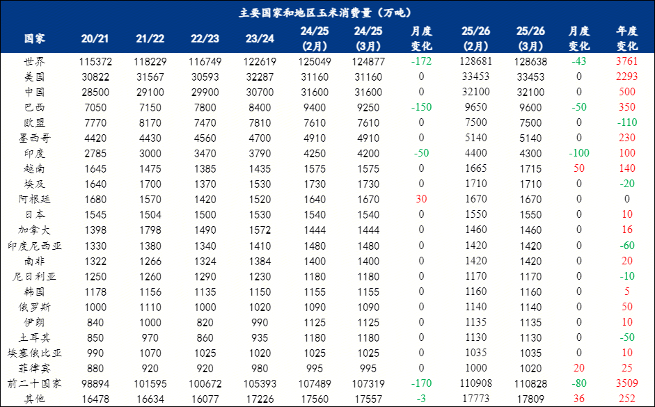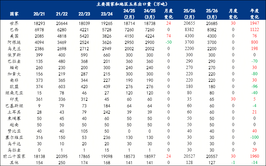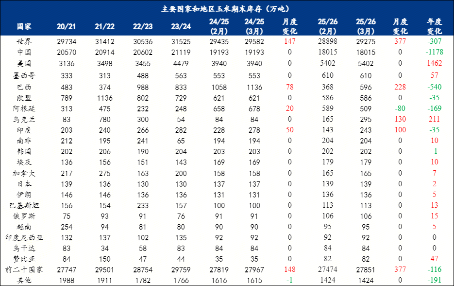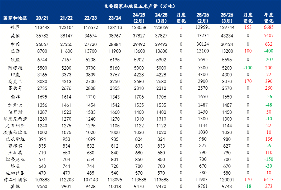 月度变化(2025/2026年度):世界玉米产量较2月预估调增153万吨,至12.9744亿吨;其中巴西调增100万吨,阿根廷调减100万吨,乌克兰调增170万吨,前二十国家总产量相应调增170万吨,至12.0001亿吨。