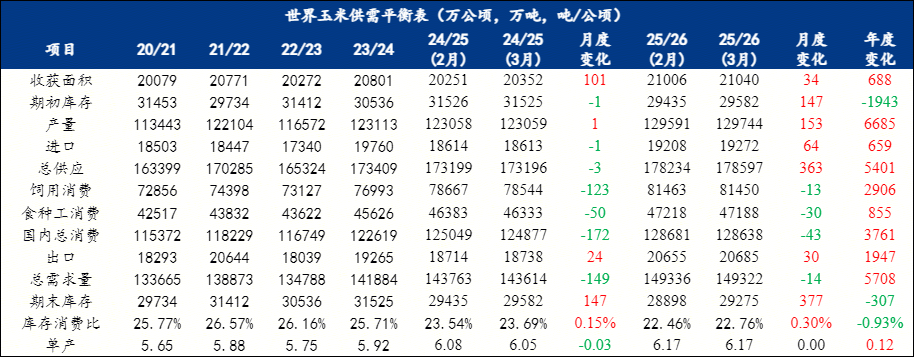 2025/2026年度世界玉米产量较2月预估调增153万吨,至12.9744亿吨。总消费较2月预估调减43万吨,至12.8638亿吨。期末库存较2月预估调增377万吨,至2.9275亿吨,库存消费比上升至22.76%,同比下降0.93个百分点。