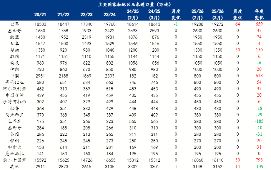 月度变化(2025/2026年度):世界玉米进口量较2月预估调增64万吨,至1.9272亿吨。其中越南(+50万吨)。前二十国家和地区总进口量较2月预估调增50万吨,至1.6110亿吨。