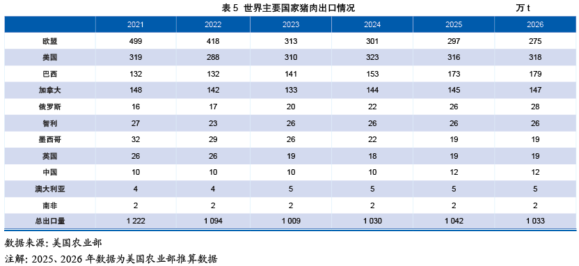 (3)欧盟:产能持续下滑。受环保法规收紧、生产成本高企及疫病持续困扰等综合压力影响,欧盟生猪产业被迫收缩。具体数据显示,欧盟27国的生猪存栏量已从2016年的14 265万头显著下降至2025年的12 850万头,同期猪肉产量也由2 295万t降至2 180万t。