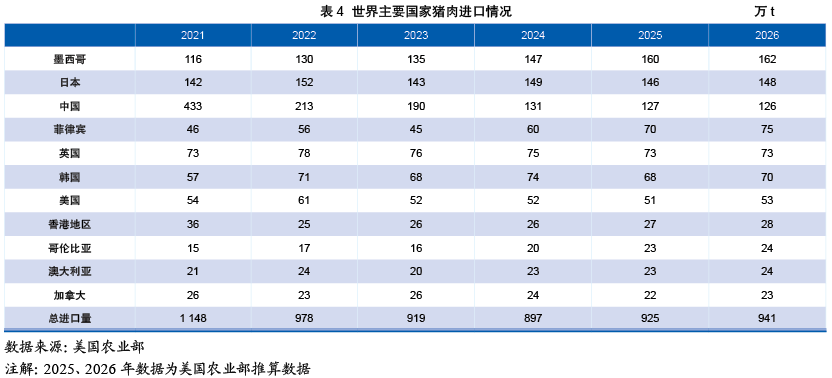 (2)进口方:墨西哥成为新中心。中国在产能快速恢复后,进口需求急剧下降,从2021年的峰值433万t骤降至2025年的127万t。这一根本性转变使得全球进口需求重心转移,墨西哥、日本、菲律宾、韩国等成为进口需求的主要增长点。其中,墨西哥的进口量持续增长,至2025年达160万t,已成为全球最重要的猪肉进口国之一,这与其国内生产无法完全满足快速增长的需求有关。