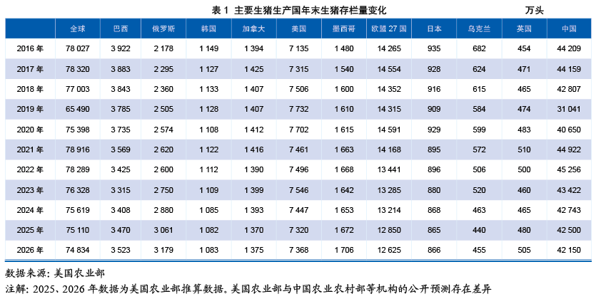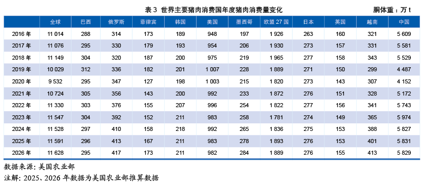 (1)中国:趋于稳定。中国生猪存栏量从2019年ASF导致的低谷(31 041万头)强劲反弹,至2021年达到峰值(44 922万头)后进入调整期。到2025年,存栏量回调至42 500万头,较历史高点有所下降。然而,猪肉产量却达到5 938万t,创下历史新高。