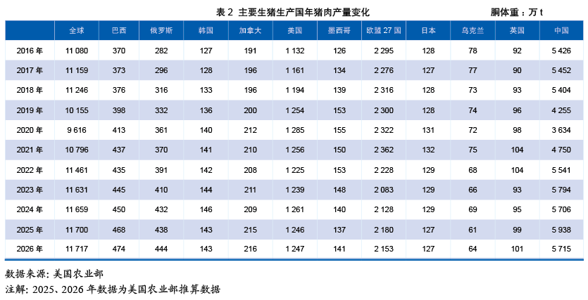 主要生猪生产国年末生猪存栏量变化见表1,主要生猪生产国年猪肉产量变化见表2。