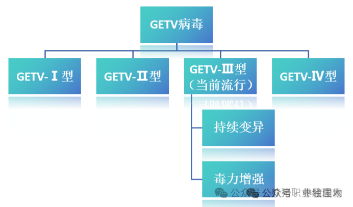 盖塔病毒基因组为单股正链RNA病毒,病毒颗粒呈球形,直径约70纳米,有囊膜结构。基于E2基因的系统发育分析,可将GETV划分为4个基因型(Ⅰ、Ⅱ、Ⅲ、Ⅳ),其中Ⅲ型毒株在我国占据主导地位且广泛流行,不过与经典毒株(MM2021)亲缘关系较远。尤其值得关注的是2024年河南、湖北的GETV疫情,是由GETV-Ⅲ型变异株引起,其E2蛋白发生了特定的氨基酸突变,导致病毒毒力增强,这为养猪业带来了新的挑战。