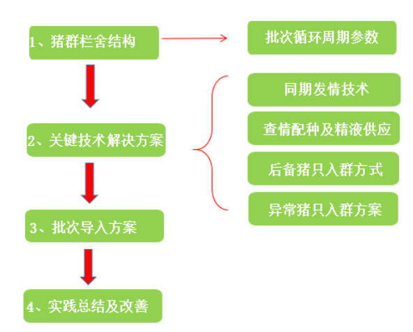猪场批次化生产是利用一系列管理手段或者生物技术手段等,根据母猪群规模及实际栏舍数量将猪群生产工作按照计划分群管理,将原先每天几乎都有的配种、分娩和断奶等连续工作集中在一个较短的周期内完成的生产管理体系。