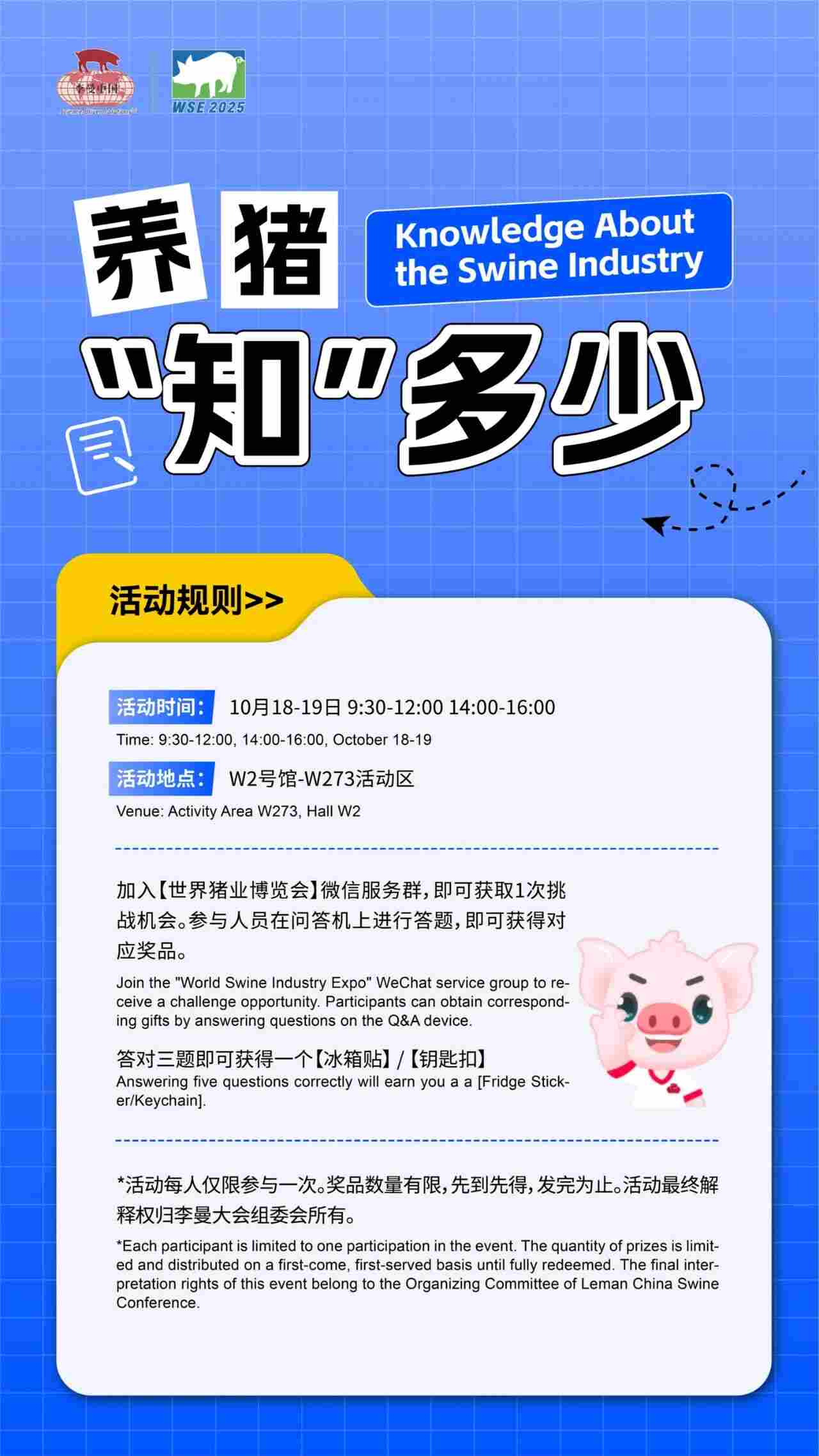 大会将于2025年10月18-20日在长沙隆重举办。诚挚邀请您抓住机遇,即刻行动,通过抖音搜索“第十四届李曼中国养猪大会世界猪业博览会”线上购票,诚挚邀请您抓住机遇,即刻行动,解锁多重专属福利。无论您是养猪产业链上的专业人士,还是对现代养殖业充满兴趣的普通观众,都能在这里见证行业最新成果、结识全球精英、探索合作机遇。金秋十月,让我们相聚长沙,共话养猪业的稳健发展,携手共创行业美好未来!