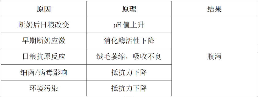 仔猪断奶后由于应激和胃内pH值上升,导致有益菌数量减少,改变了仔猪小肠环境,肠道菌落紊乱,导致致病菌吸附在肠绒毛上,分泌毒素侵蚀肠绒毛和肠道表面,破坏肠道的吸收能力,从而导致仔猪腹泻。