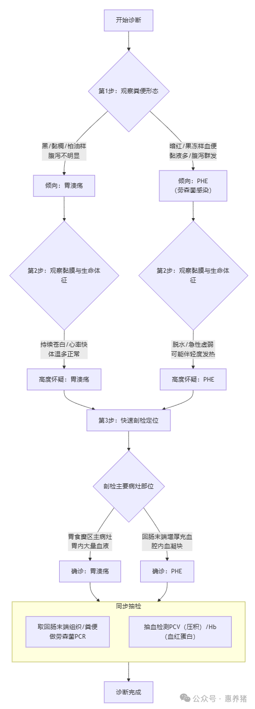 目测颜色与性状即可初筛;若条件允许,可做潜血试验,但两者均可能阳性,需结合剖检与部位特异性病灶判断。(潜血试验,又称为便潜血试验,是一种用于检测粪便中肉眼无法看见的微量血液的医学检验方法,核心目的为检测是否存在慢性、微量的消化道出血。这种出血量非常少,不会改变粪便的颜色和性状,因此通过肉眼观察根本无法发现。)