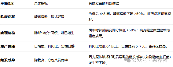 猪气喘病疫苗(主要是灭活疫苗)的效果评估不能只看“打没打针”,必须结合上述量化指标进行综合判断。评估体系通常包含四个维度:免疫学指标、临床指标、生产指标和病理指标。