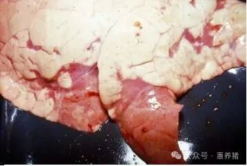 淋巴组织增生:切面可见支气管周围有灰白色增生灶(这是支原体的特征性病理变化)。
