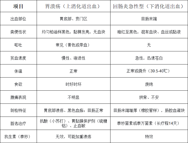在育肥猪生产中,当发现猪排出黑色稀粪时,许多养殖户甚至部分技术人员的第一反应往往是“回肠炎急性型”,立即使用泰妙菌素或泰万菌素进行治疗。然而,临床上有另一种更为常见的疾病(胃溃疡),同样以“黑粪”为典型表现,且两者在发病机制、粪便性状、伴随症状及治疗方案上存在本质差异。误诊不仅延误治疗,还可能因错误用药加重病情,造成不必要的经济损失。本文从出血部位、粪便特征、临床体征及剖检病变四个维度,详细阐述胃溃疡(上消化道出血)与回肠炎急性型(下消化道出血)的鉴别要点。