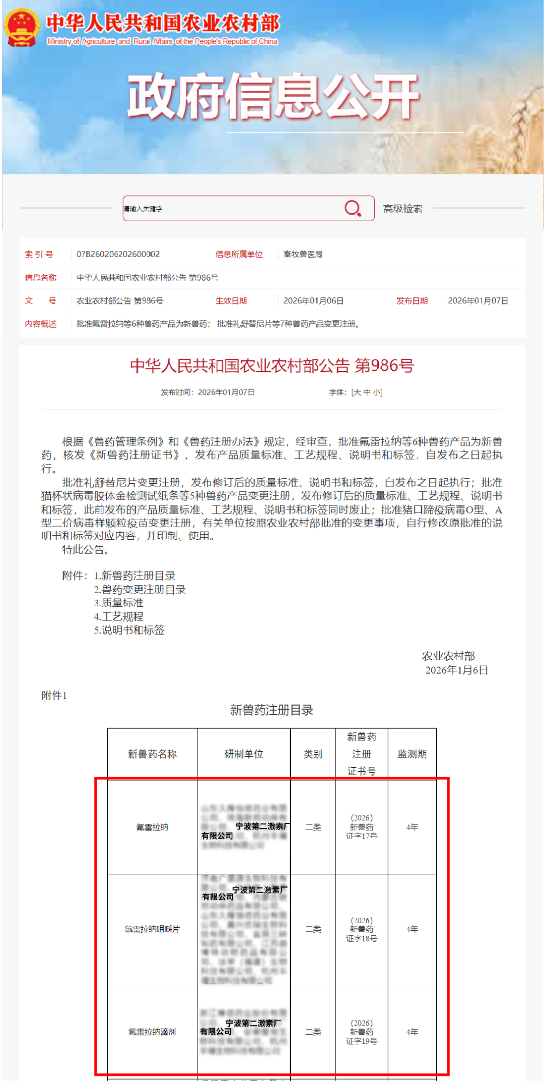 宁波第二激素厂有限公司研制的“氟雷拉纳制剂”、“氟雷拉纳滴剂”、“氟雷拉纳咀嚼片”获得农业农村部批准为国家二类新兽药。其中,氟雷拉纳咀嚼片为全国首批获批的咀嚼片剂型。