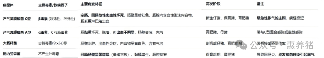 产气荚膜梭菌根据其产生的四种主要毒素(α,β,ε,ι)分为A、B、C、D、E五型。其中,引起育肥猪和成年猪急性胀气的主要是C型和A型,尤其是C型菌株,其产生的β毒素是一种强力的坏死性和致死性毒素,对肠道黏膜具有极强的破坏力。