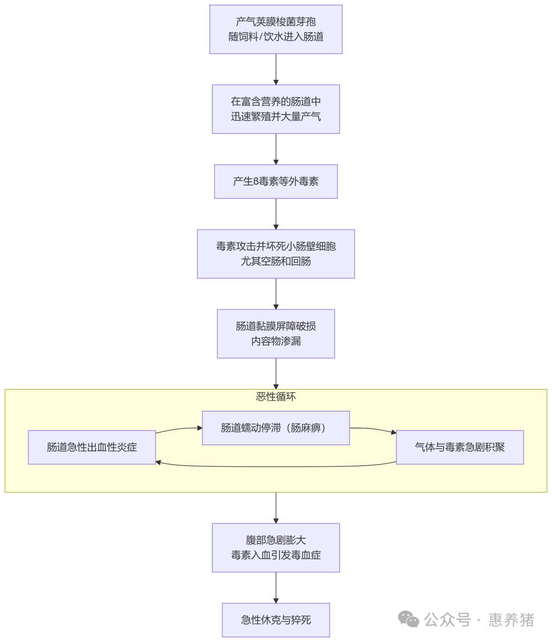 促发因素:高蛋白、高能量日粮是主要诱因。研究表明,当饲料中豆粕等非淀粉多糖(NSP)含量过高时,后肠发酵加剧,为梭菌繁殖提供了底物。饲喂不规律、突然换料等应激也会打破肠道菌群平衡,诱发该病。