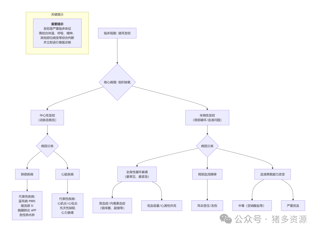 猪只耳朵发绀,本质上是一种可视黏膜(皮肤)毛细血管中还原血红蛋白(未携氧的血红蛋白)增多,或异常血红蛋白(如高铁血红蛋白)沉积的表现。其直接原因是局部或全身性的组织缺氧。耳朵因皮肤薄、血管丰富、处于末梢,是发绀最易被观察到的部位之一。