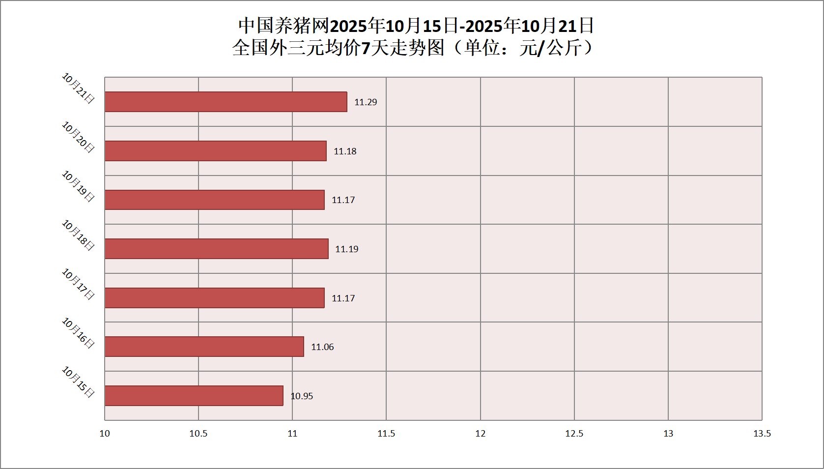 2025年10月21日(星期二),据中国养猪网猪价系统监测,全国外三元均价为11.29元/公斤,猪价较昨日(11.18元/公斤)上涨了0.11元/公斤,较上月(12.75元/公斤)下跌了1.46元/公斤。