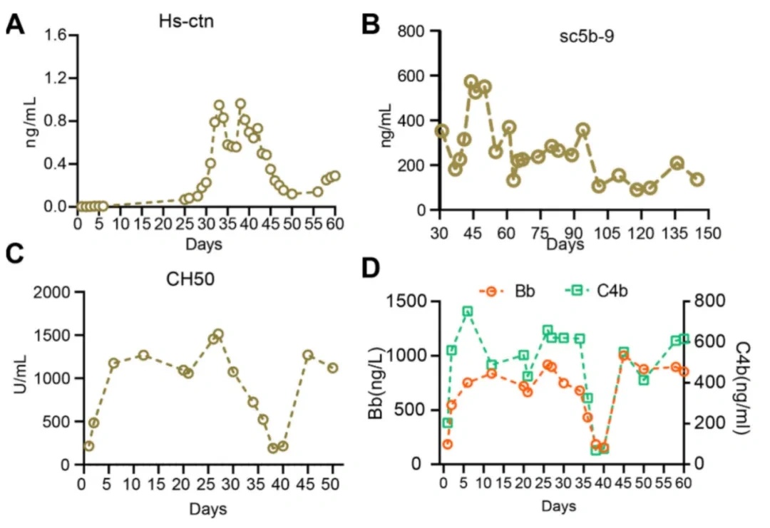 血清总补体活性(CH50)测量显示,从第5天开始显著增加,在第26天和第27天达到峰值1514U/mL。